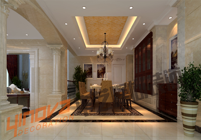歐式獨棟別墅餐廳非常豪華但是并沒有加入很多的裝飾,再設計的過程中主要是以簡練為原則,將歐式風格簡練化,提出歐式風格的精髓,因此這樣的別墅更加豪華、閃亮。