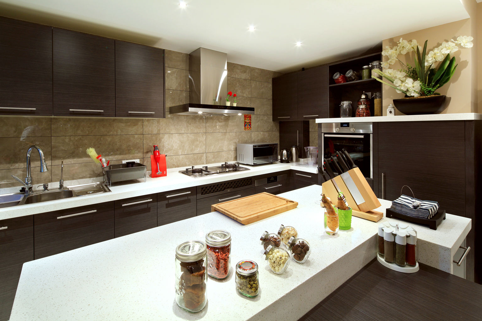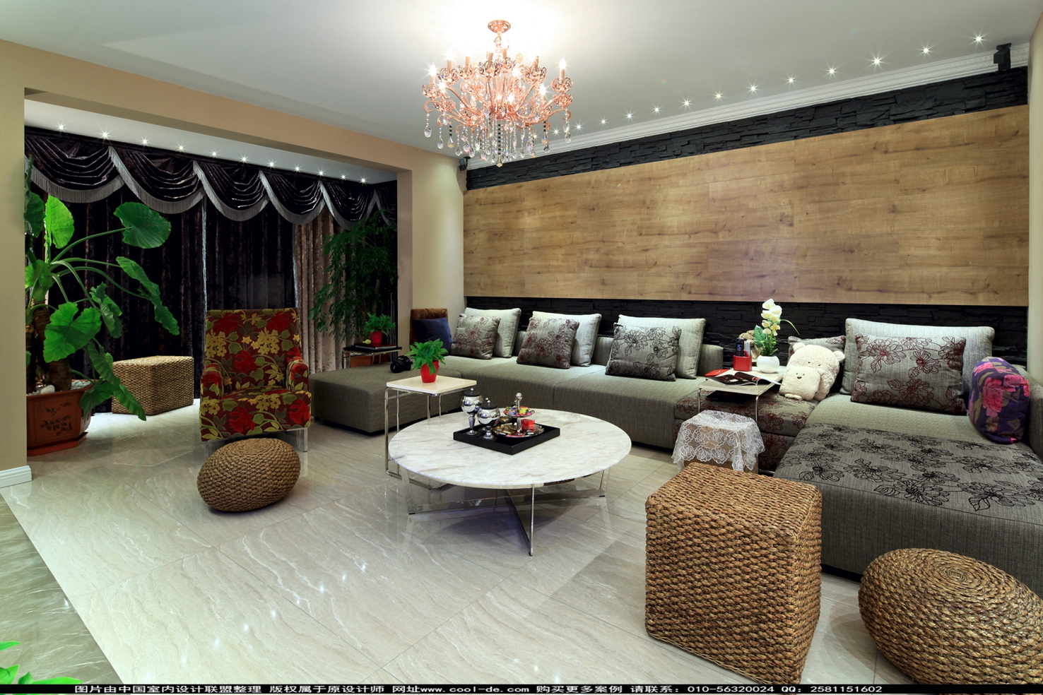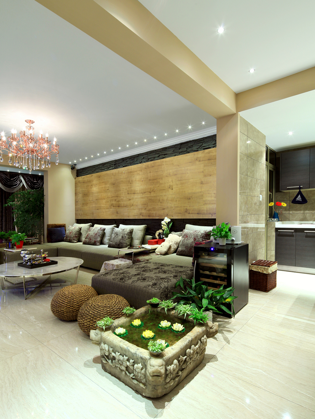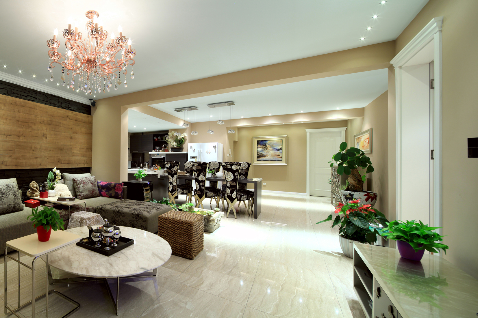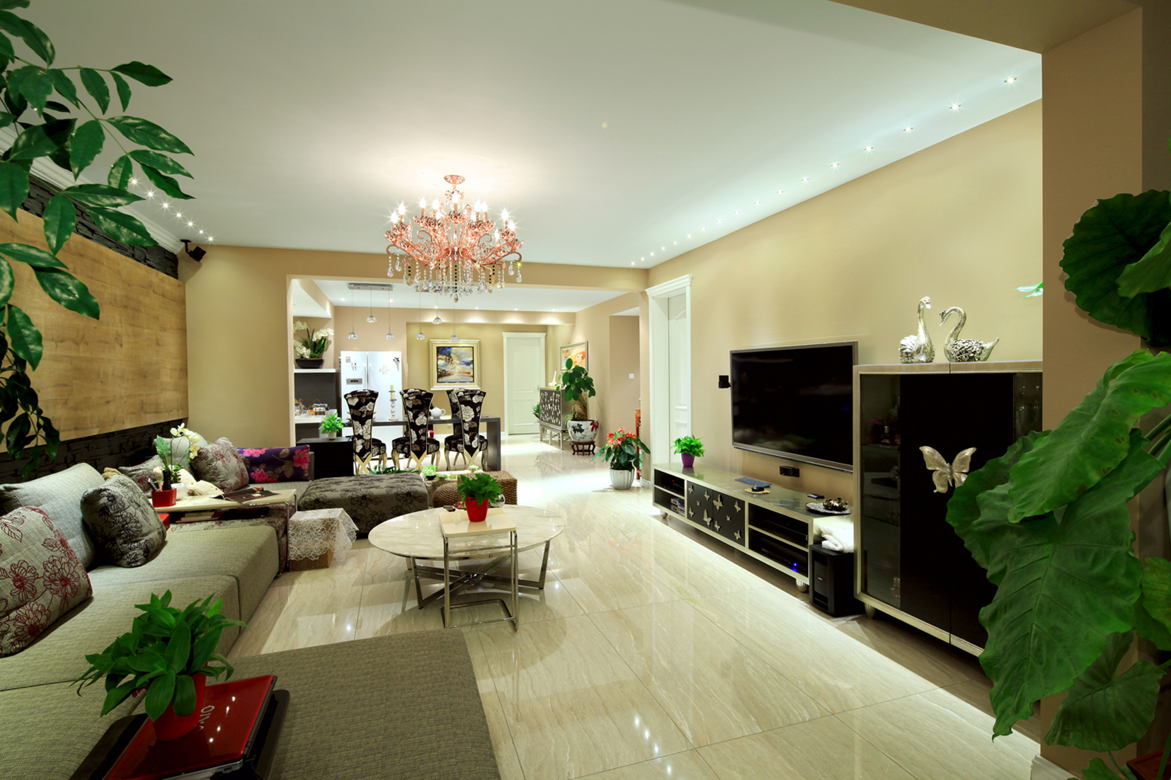 精美奢華的多層次的吊燈加上高雅的吊頂設(shè)計堪稱完美,不但巧妙地增添了房間的層次感和質(zhì)感還于無形中增添了房間的豪華的視覺享受。房間的而整個設(shè)計奢華而不浮躁,簡約而不簡單,莊重而不木訥。簡約亮眼的紅木色沙發(fā)配置,水靈經(jīng)驗的大紅色裝飾,為整個房間增添了一縷縷生動和活力。
