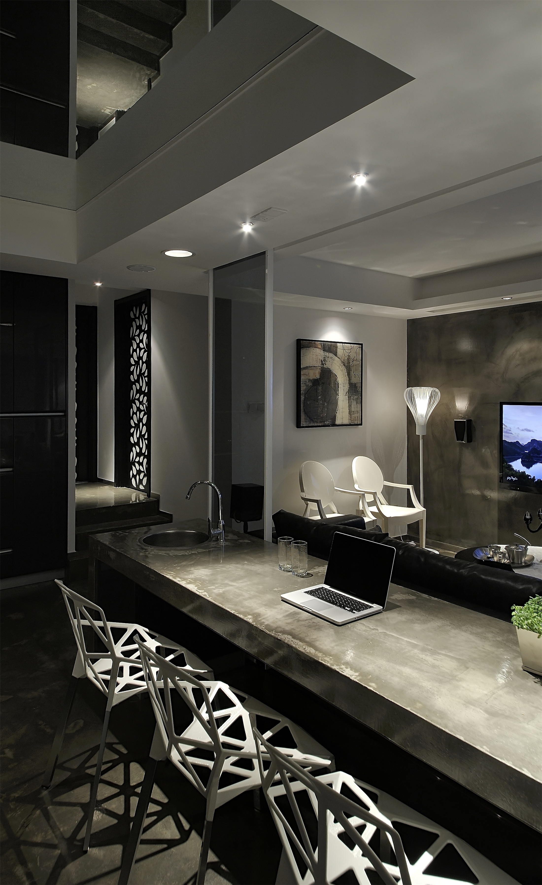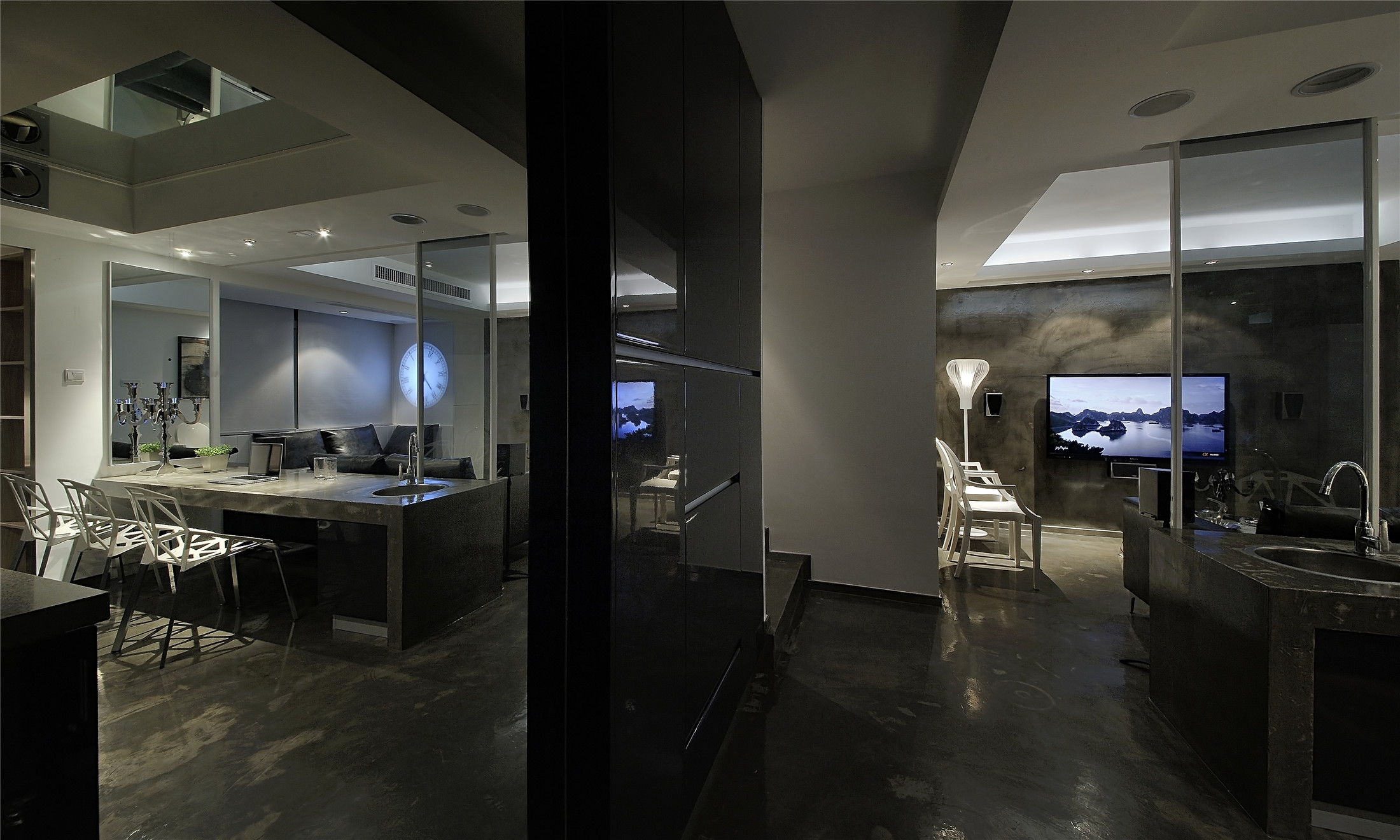“不用一片瓷磚”,設(shè)計(jì)之初,主人便給這個(gè)新家烙上了鮮明的材質(zhì)標(biāo)簽。當(dāng)我們走進(jìn)這個(gè)空間時(shí),“酷”這個(gè)字眼是對(duì)目之所及的區(qū)域最佳的注解。以較少的色彩,加之金屬與玻璃塑以冷峻,營(yíng)造出居室的男人味。當(dāng)這樣一個(gè)居家空間呈現(xiàn)在我們面前的時(shí)候,審美上的愉悅不加醞釀地沖擊著我們的內(nèi)心。